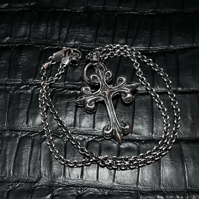 アイアンクロスにスカルが乗ったネックレスです。 ペンダントトップのみの販売もしています。 燻仕上げなので、落ち着いた雰囲気。 ネックレスをご希望の場合 オプションより選択下さい。 sv925