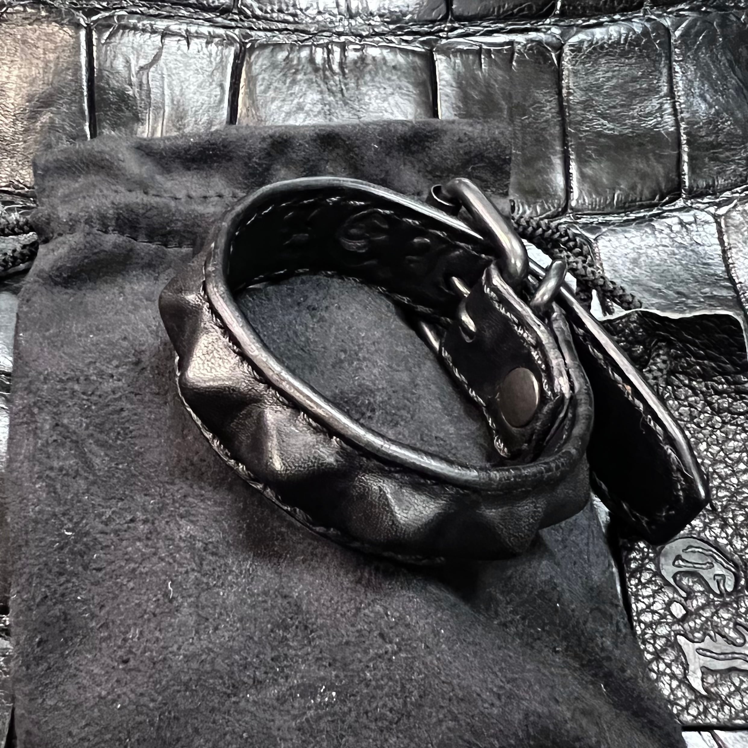 10mmのピラミッドスタッズを革の内側に独自の技法で隠し込んだリストバンドです。